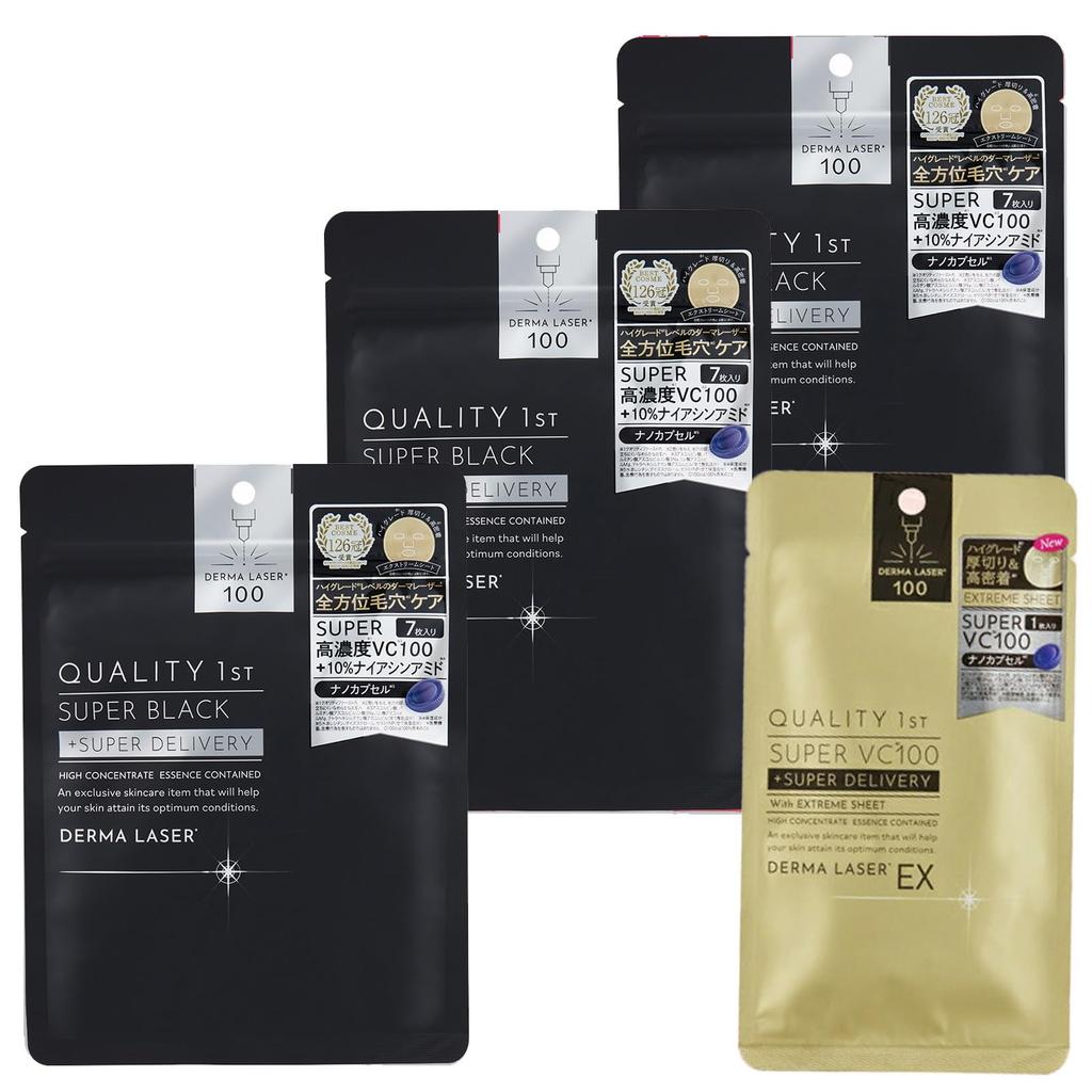 [Product Details] Set contents: Derma Laser* Super Black Mask (7 masks) x 3, Derma Laser EX Super VC100 Mask (1 mask) / Free of preservatives, alcohol, synthetic coloring, fragrance, and mineral oil / *Not a medical device or medical procedure