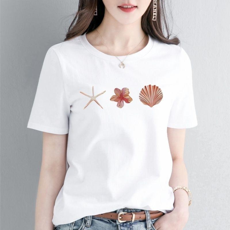 Starfish and Shell Floral Print Short-sleeved T-shirt Casual and Simple Style Daily and Outdoor Wear Women Clothing Fashion Y2K
