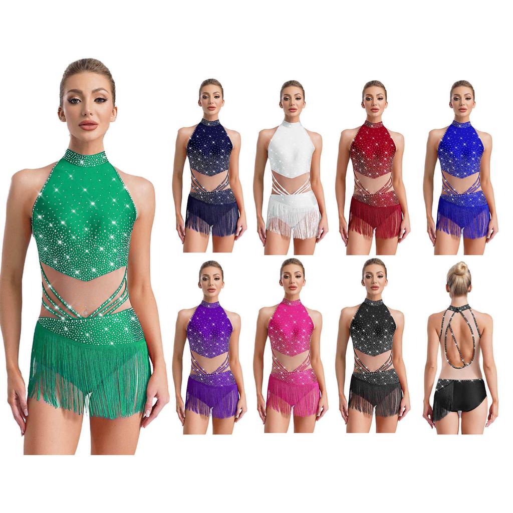 Womens Latin Dance Leotard Sleeveless Mock Neck Sparkle Rhinestones Tassel Detail Competition Outfit