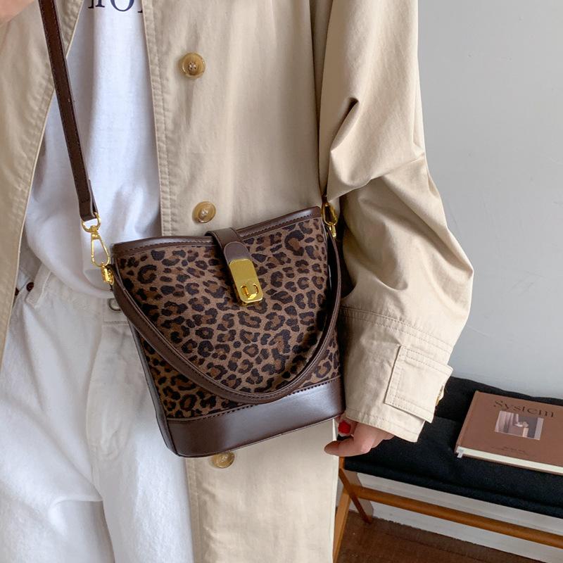 Niche Design Leopard Print Bucket Bag Women's 2025 New Retro Fashion Portable Commuter Bag Fashion Shoulder Messenger Bag