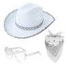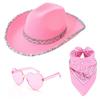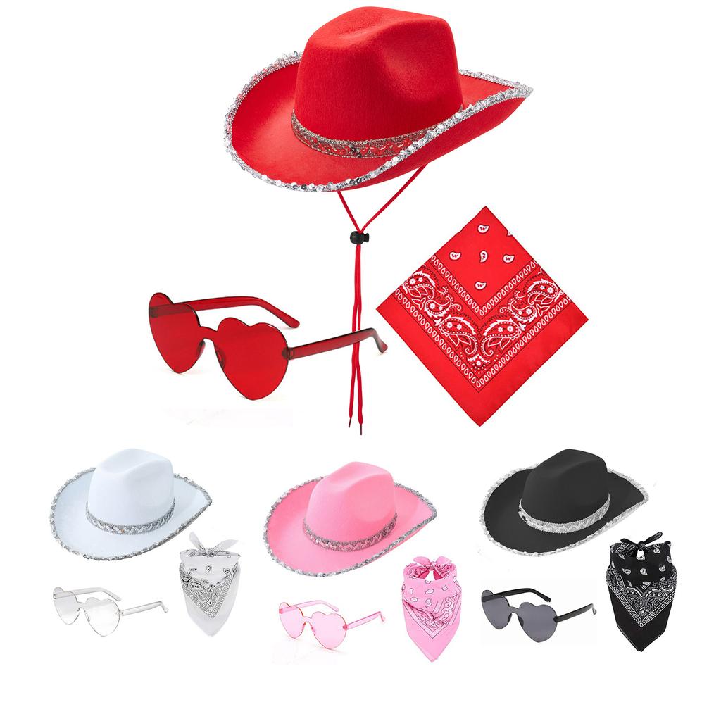 Cosplay Costume Wide Brim Cowboy Hat Set: The lovely wide brim cowboy hat with fashion appearance, hat featured with sequined decors fashion and better show the personality and highlight your unique aesthetic, heart shape sunglasses & handkerchief suitable for party dressing.