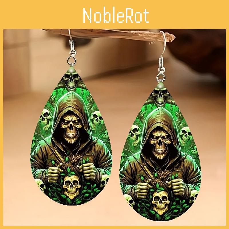 These Halloween-themed acrylic drop earrings feature a sleek water-drop shape with skull head designs, adding a touch of spooky elegance. Made of durable acrylic, with printed details for vivid appearance. Suitable for festive events or costume parties, they support easy cleaning with a damp cloth, providing a lightweight and versatile accessory for both men and women.