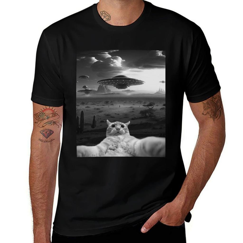 Alien UFO Funny Cat T-Shirt T Shirts for Man Cotton Funny T Shirts Cotton 100% T-Shirt