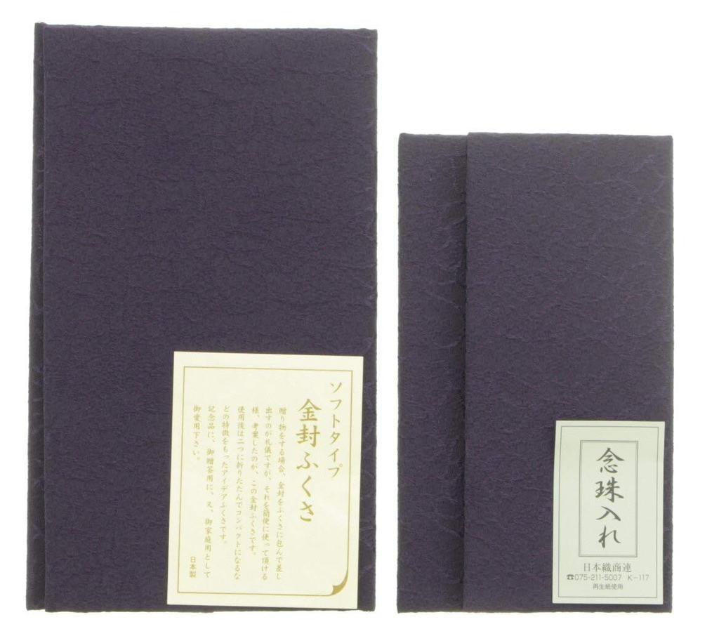 Taiko Sangyo Chirimen Silk Fukusa (Crepe Fabric) Soft Set with Gold Envelope and Prayer Beads Case, Purple, Made In Japan