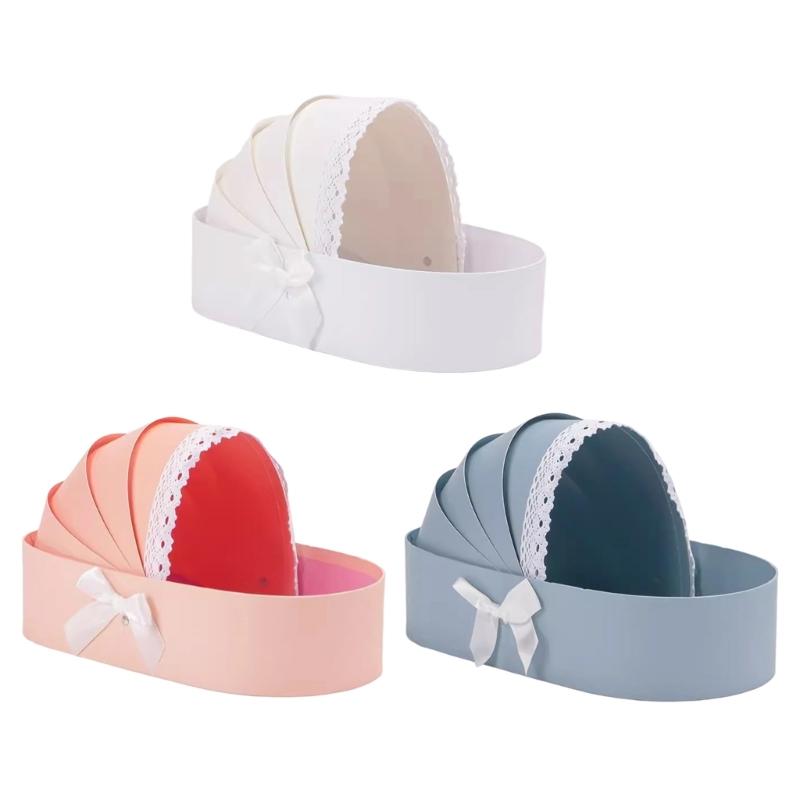 Unique cradle shape designs and crafted from cardboard, this baby showers gift box flower basket securely displays flower bouquets, baby showers gifts, fruit, baby toy, chocolate, cookie, sweet, dessert, or home decoration items while maintaining elegant presentation.