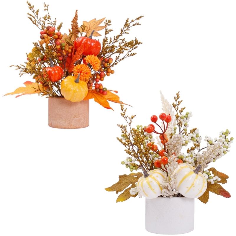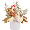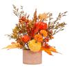 Bring the essences of autumn indoors with this realistic faux maple leaf, pumpkins, and rice stalk arrangement that maintains its bright color without wilting or maintenance.