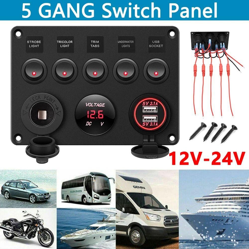 Dual USB Socket 5 Gang Switch Panel 12V/24V ON-OFF Toggle For Car Inline Fuse Box RV