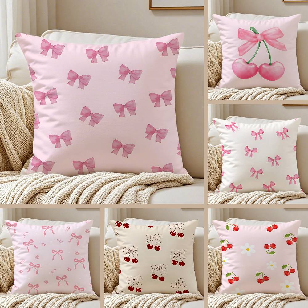 Pink Bow Cherry Pillow Case Sofa and Living Room Decorative Cushion Covers Dust-proof and Mite-proof Invisible Zipper