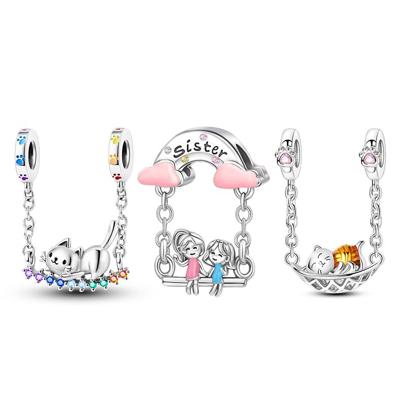 Original Charms Copper Cat Hammock Double Ring Pendant & Swing Charms Fits 3Mm Original Bracelet Women Diy Jewelry