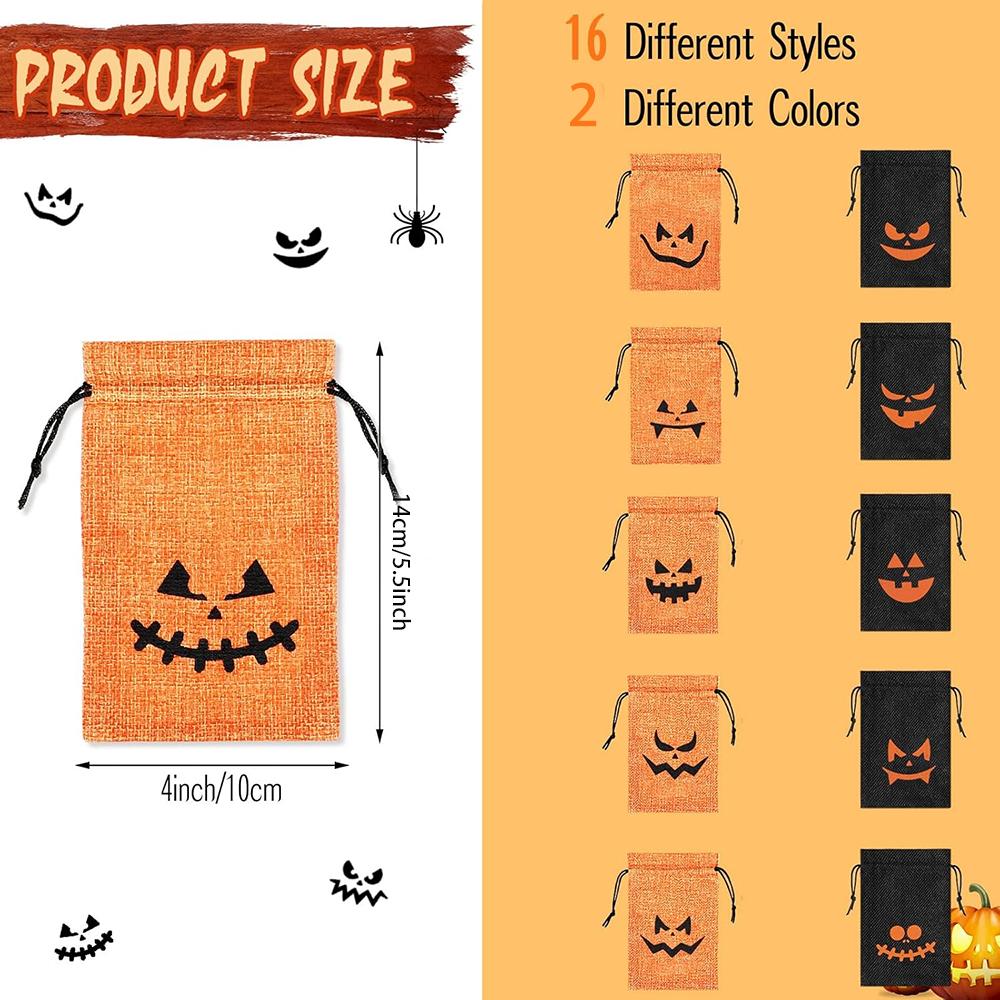 16pcs Pumpkin Burlap Candy Bags Spooky Drawstring Bag Trick or Treat Gifts for Kids Birthday Halloween Party Decoration Supplies