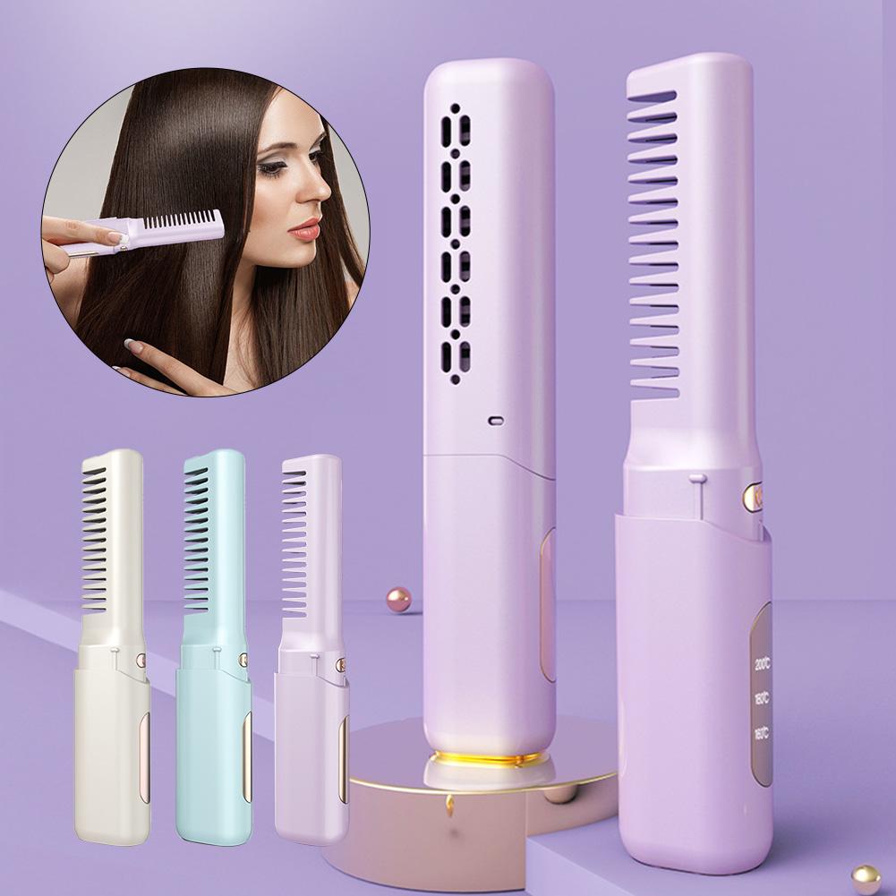 2-in-1 Mini Travel Hair Styler Wireless USB-C Rechargeable Curling & Straightening LCD Comb Auto Shutoff for Travel Beauty Hair Tool