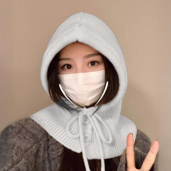 Yousheng Hooded Scarf Hat Solid Color Adjustable Drawstring Pullover Hat Buttons Closure Knitted Winter Hat Loose Fit Neck Gaiter