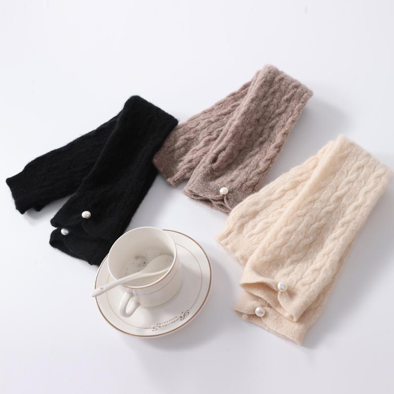 Women's 100% Cashmere Half-Finger Gloves – Pearl-Knit Detailing, Thick Warm Long Twisted Pattern for Winter Fashion