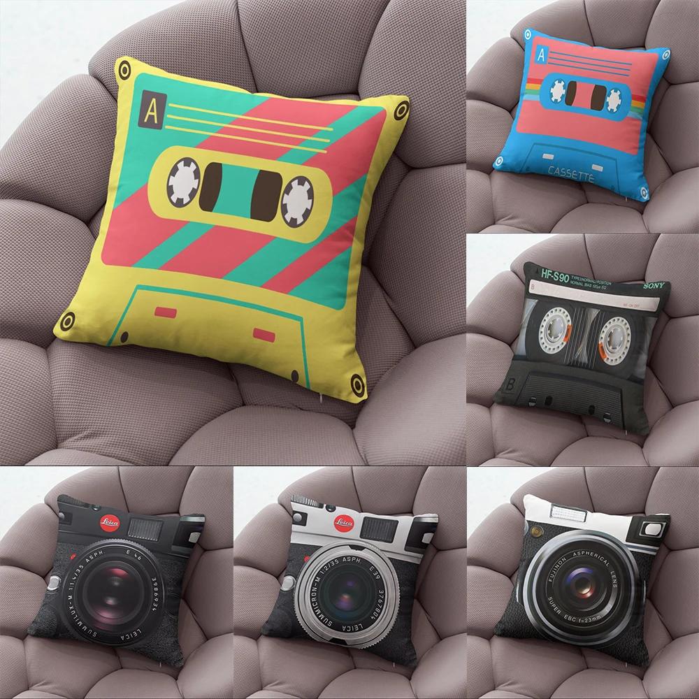 Fun Decorative Pillow Cover With Music Tape Print Cute Kawaii Camera Sofa Bedside Cushion Cover Short Plush Zipper Pillowcase