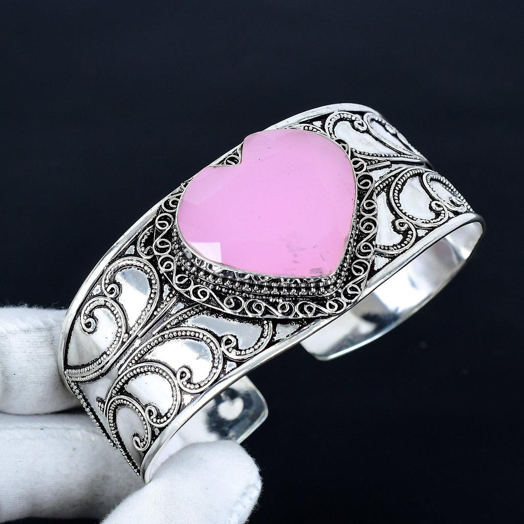 Pink Chalcedony Heart Gemstone Bracelet, Bangle Adjustable Bracelet, 925 Sterling Silver Jewelry, Engagement Gift, Pink Chalcedony Bracelet Gift