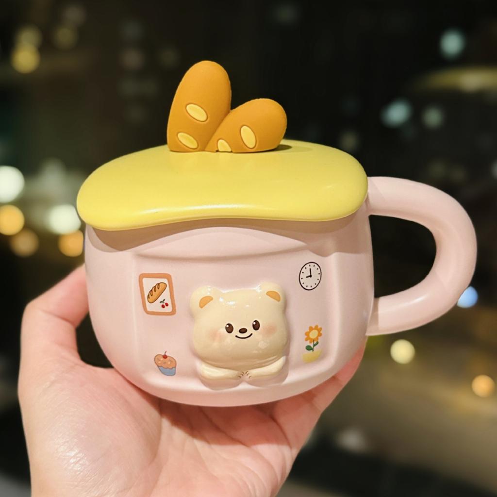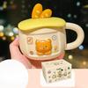 Cute Ceramic Mug with Lid Creative Household Milk Oatmeal Cup Cheese Bread Cute Bear Cartoon Cup Souvenir