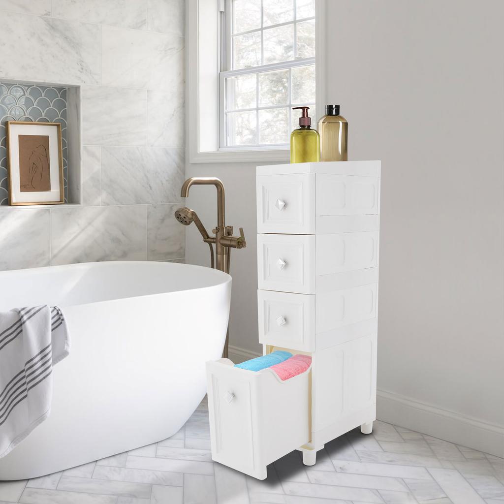 Tall Bathroom Floor Cabinet with 4 Tiers, Narrow Slim PP Storage Organizer, Free Standing Cabinet, Modern White Storage Shelf