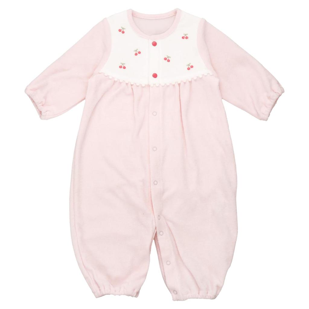 The cute design features embroidery scattered across the chest. The fluffy, soft pile material can be worn from autumn to early spring. It comes as a dress-style garment that completely covers the baby's legs immediately after birth. Once the baby's legs start to move, you can fasten the buttons to turn it into a coverall style, making it a two-way design.