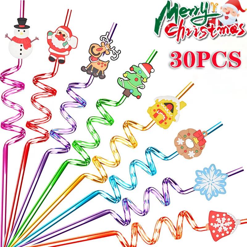 10-30PCS Christmas Party Straws Pvc Cartoon Santa Claus Snowman Personalized Straws Holiday Party Decoration Recyclable Straws
