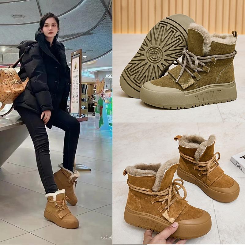 Fleece Leather Snow Boots Women's Winter New High-top Cotton Shoes Versatile Casual Thick Sole Thickened and Comfortable