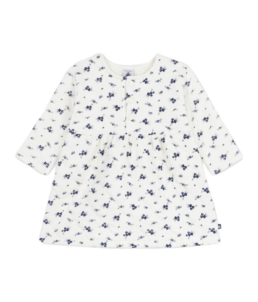 This long-sleeved dress features a lovely floral pattern, creating a sophisticated look. Made from soft, environmentally friendly cubic fabric woven from two layers of fabric, it's popular for its comfortable fit. The under-bust panel and gathers allow for a varied silhouette, making it a versatile piece for everyday wear or a stylish outing. Note: The quilted material may leak out of the seams. Cut any leaked out filling with scissors without pulling. Applying pressure to the quilted seams may cause the threads to fray or break, so please handle with care.