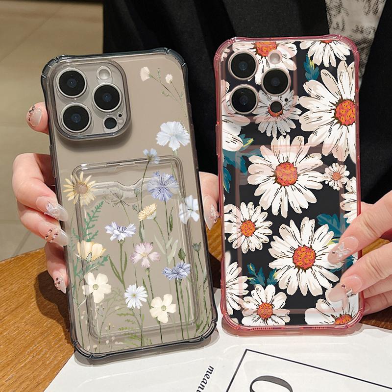 Flowers Print Card Slot Phone Case For iPhone Air 16e 17 16 15 Pro Max 14 13 Pro Max Shockproof Clear Soft Silicone Cover