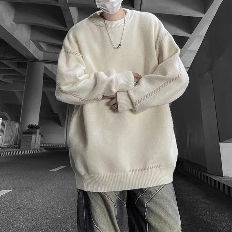 Japan Style Solid Color Knitted Pullovers Autumn Winter Vintage O-Neck Men's Clothing Chic Bright Line Decoration Loose Sweaters