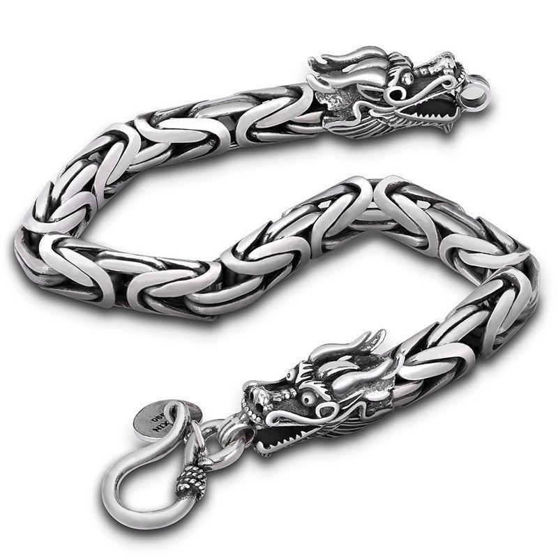 Men's Retro Thai Dragon Bracelet - Distressed Silver, Dragon Head & Bone Chain, Hip-Hop Style