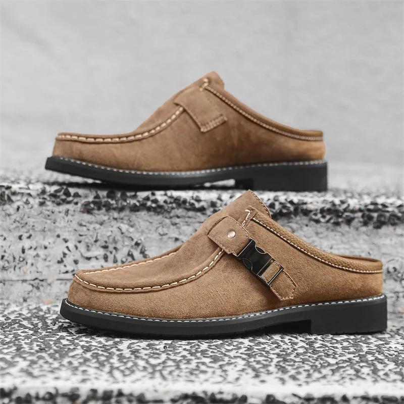 Fashion Suede Leather Half Slipper Man Design Moccasins Comfy Slip-on Slippers Casual Shoes Adult Men Muller Footwear Handmade Half Drag