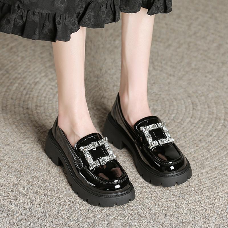 Rhinestone Buckle Small Leather Shoes Woman Japanned Oxford Platform Flats Ladies Thicken Sole Loafers Wide Feet Sneakers Female