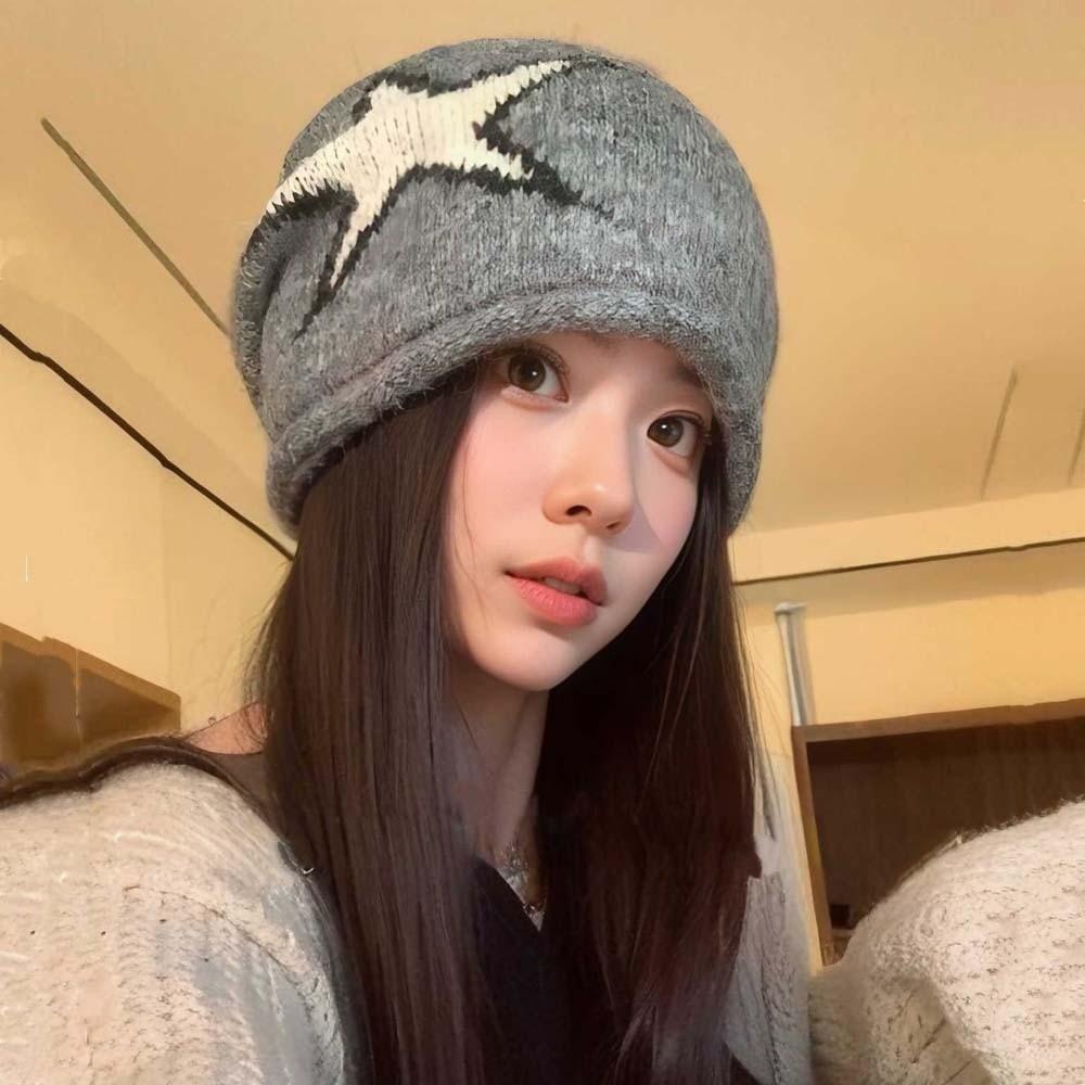 Streetwear Jacquard Woolen Hat Elastic Y2K Pullover Cap Fashion Star Knitted Hat Women