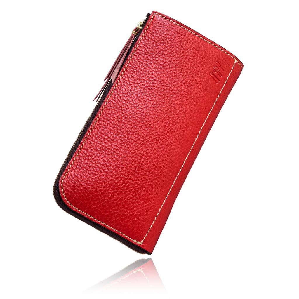 Artigianoworks Long Wallet for Men and Women, Round Zipper, Cowhide Leather, Himeji Leather, Made by YKK, Large Capacity, Card Storage, Red, Aw-05ns