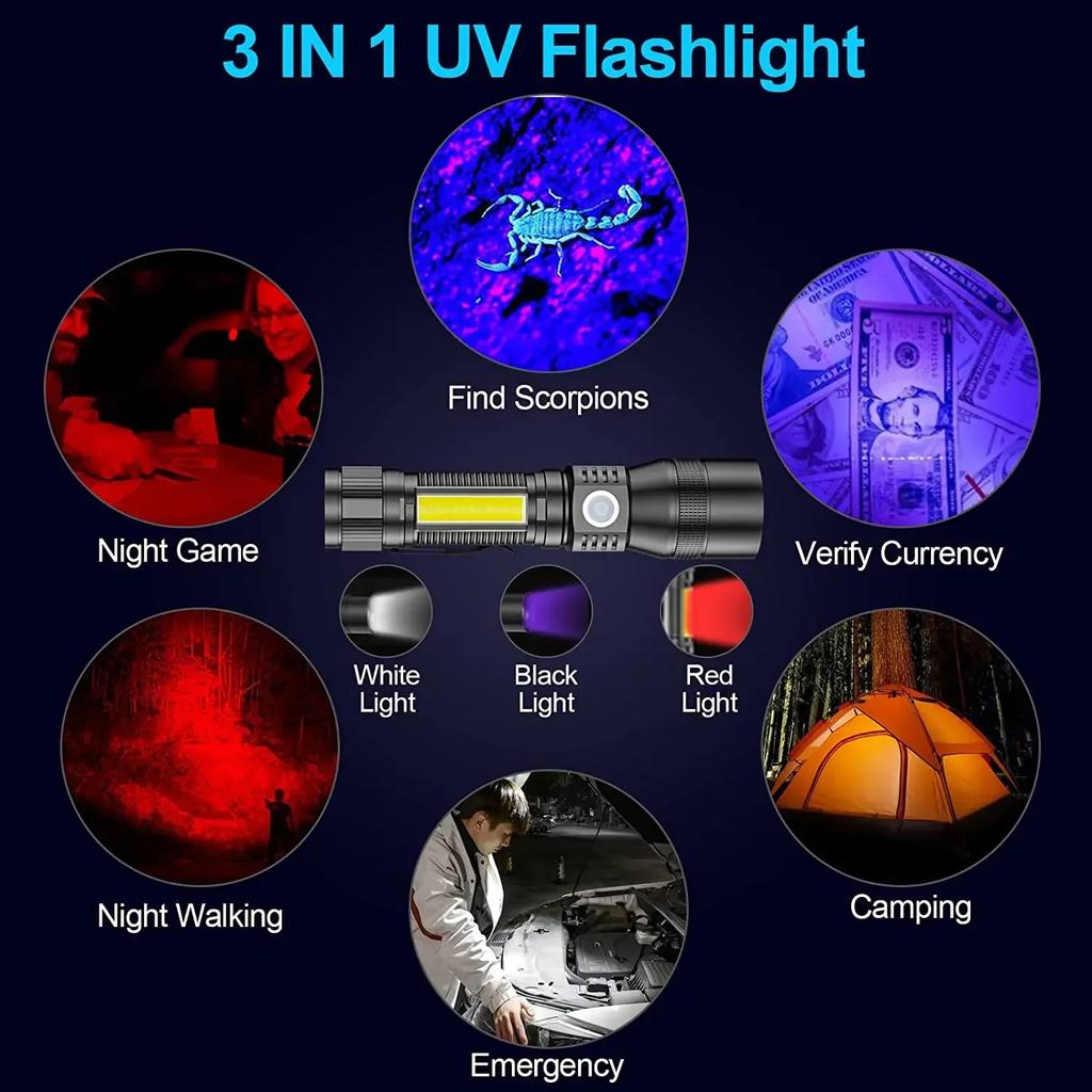 UV Light & Strong Light Flashlight USB Rechargeable Camping Lantern Pets Urine Stains Black Light Led Ultraviolet Torch Lamp