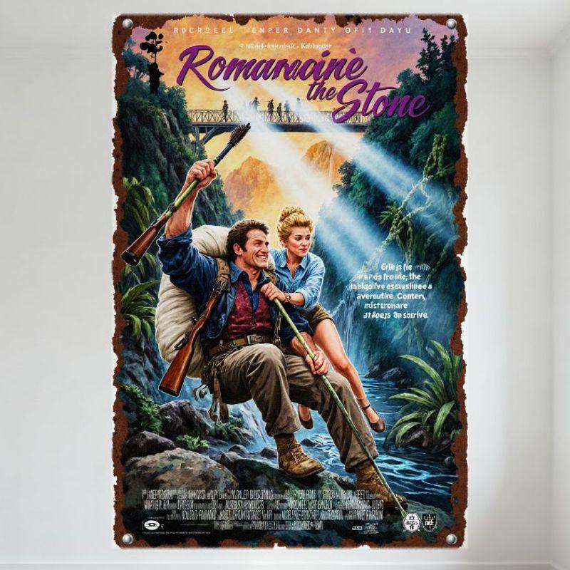 Romancing the Stone Vintage Movie Poster Metal Tin Sign, Jungle Waterfall Adventure Art Plaque for Man Cave Bar Home Decor