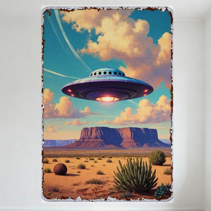 Vintage 1950s Sci-Fi Desert UFO Metal Tin Sign, Retro Flying Saucer Cactus Rock Formation Wall Plaque for Home Bar Man Cave Deco