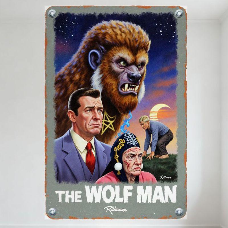 Vintage The Wolf Man Metal Tin Sign, Menacing Wolf Creature Starry Sky Crescent Moon Retro Poster for Bar Club Home Wall Decor