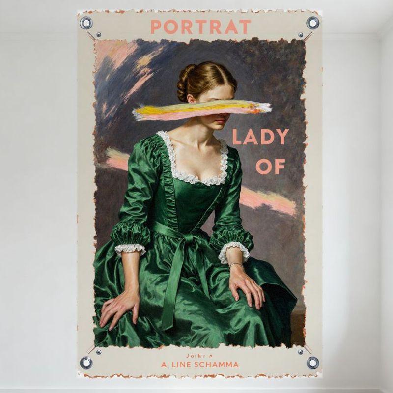 Vintage 18th - Century Lady In Green Dress Metal Tin Sign with Pink & Yellow Accents, PORTRAIT Lady of John P. A - Line Schamma