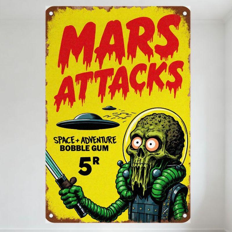 Vintage Mars Attacks Metal Tin Sign with Green Martian UFO 1950s Sci-Fi Retro Spooky Decor for Bar Home Cave