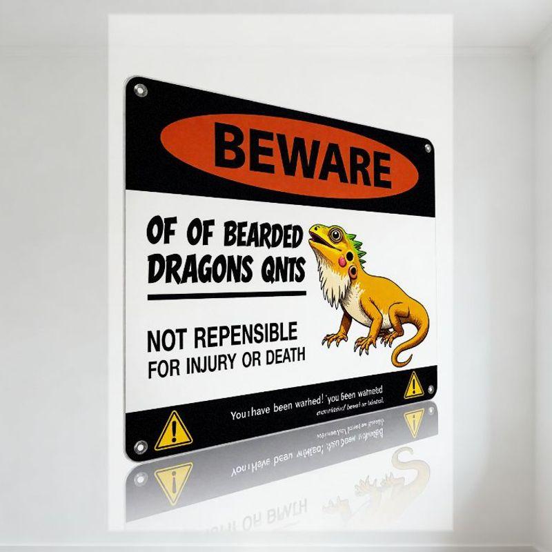 Beware of Bearded Dragons Funny Prank Metal Tin Sign - Warning of Injury, Cartoon Dragon, Home Bar Man Cave Decor