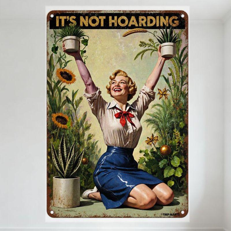 Vintage 1950s Style 'It's Not Hoarding' Plant Lover Metal Tin Sign - Woman with Plants & Butterflies Retro Propaganda Plaque for