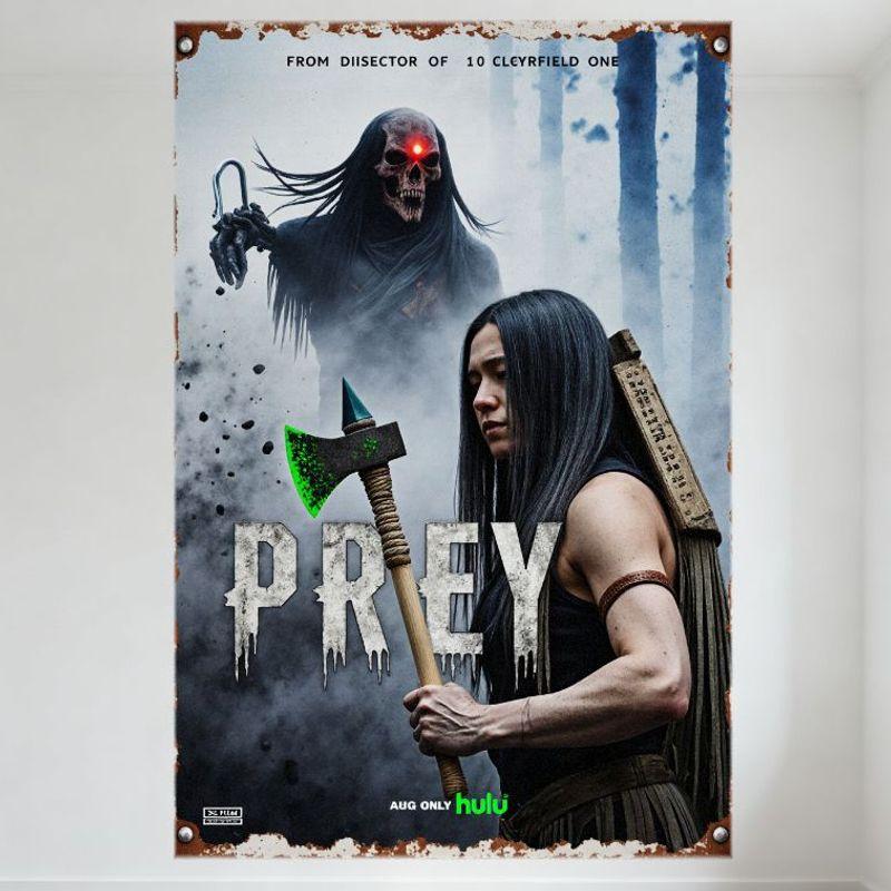 Prey Movie Poster Metal Tin Sign Rustic Weathered Border Skull Figure Axe Woman Horror Movie Plaque for Home Decor