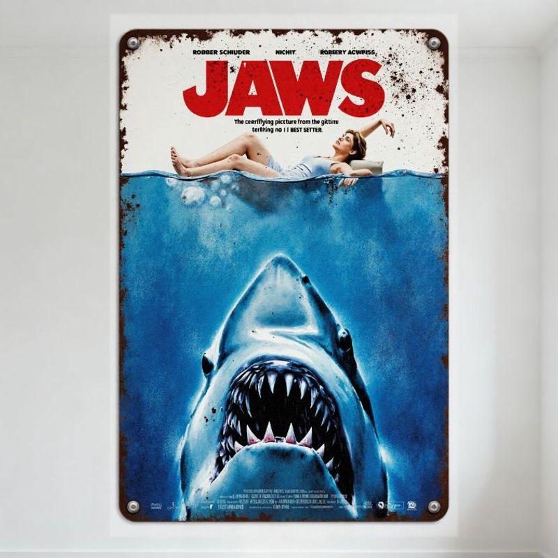Jaws Vintage Metal Tin Sign, Distressed Rusty Border, Great White Shark Attack Scene, Home Decor for Man Cave Bar Cafe, Retro Mo