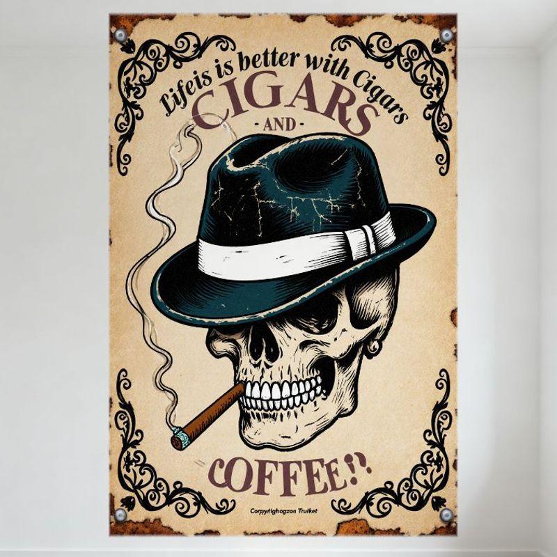 Vintage Life Is Better with Cigars & Coffee Skull Fedora Tin Sign Retro Gothic Gangster Home Wall Decor for Bar Man Cave Cafe
