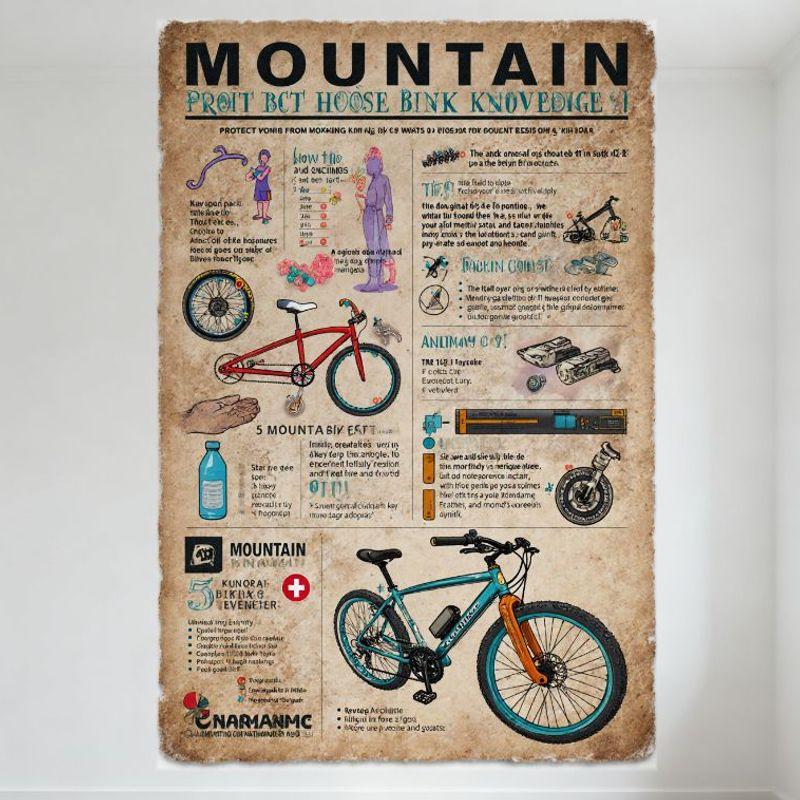 Vintage Mountain Bike Infographic Metal Tin Sign, 5 Mountain Bike Facts, Bicycle Components & Safety Knowledge, Retro Aged Paper