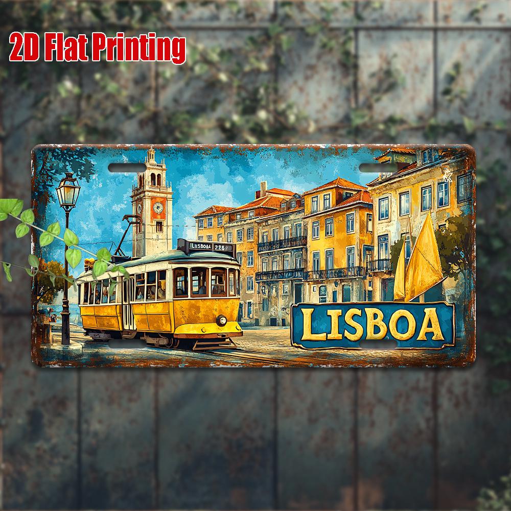Printing, , Vintage Metal License Plate, Outdoor Wall Art , Number LISBOA Aluminum Sign with Lisbon Tram Scene, for Home, Bar