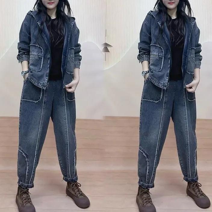 Spring and Autumn Fashion Casual Denim Jacket Spring and Autumn Two-piece Western Style Thin Harem Pants Loose Suit