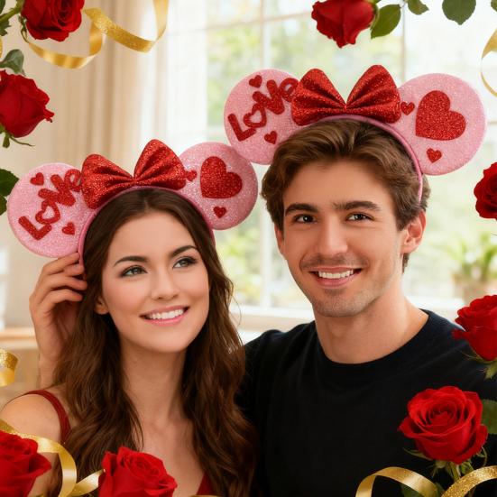 The centerpiece showcases a three-dimensional heart shape covered in sequins or fine glitter, complemented by matching bows or round ears that shimmer beautifully under light. Perfect for Valentine's Day, weddings, parties, or photoshoots, this versatile accessory adds a sweet and glamorous touch. Packaged in a velvet gift box with a greeting card, it makes a thoughtful gift for loved ones or bridesmaids.
