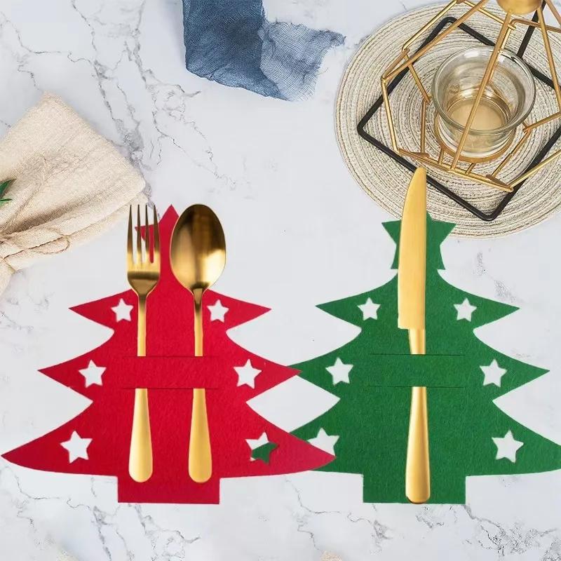 10/12Pcs Christmas Tree Felt Placemat Set Holiday Tableware Protector Forks Spoons Holder Festive Dining Table Decor