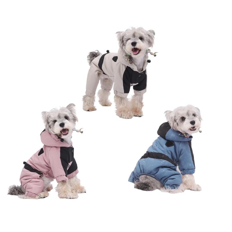 Four leg design with secure wear and down filling allow unrestricted movement while keeping pet warm, featuring press button closures for easy wear.