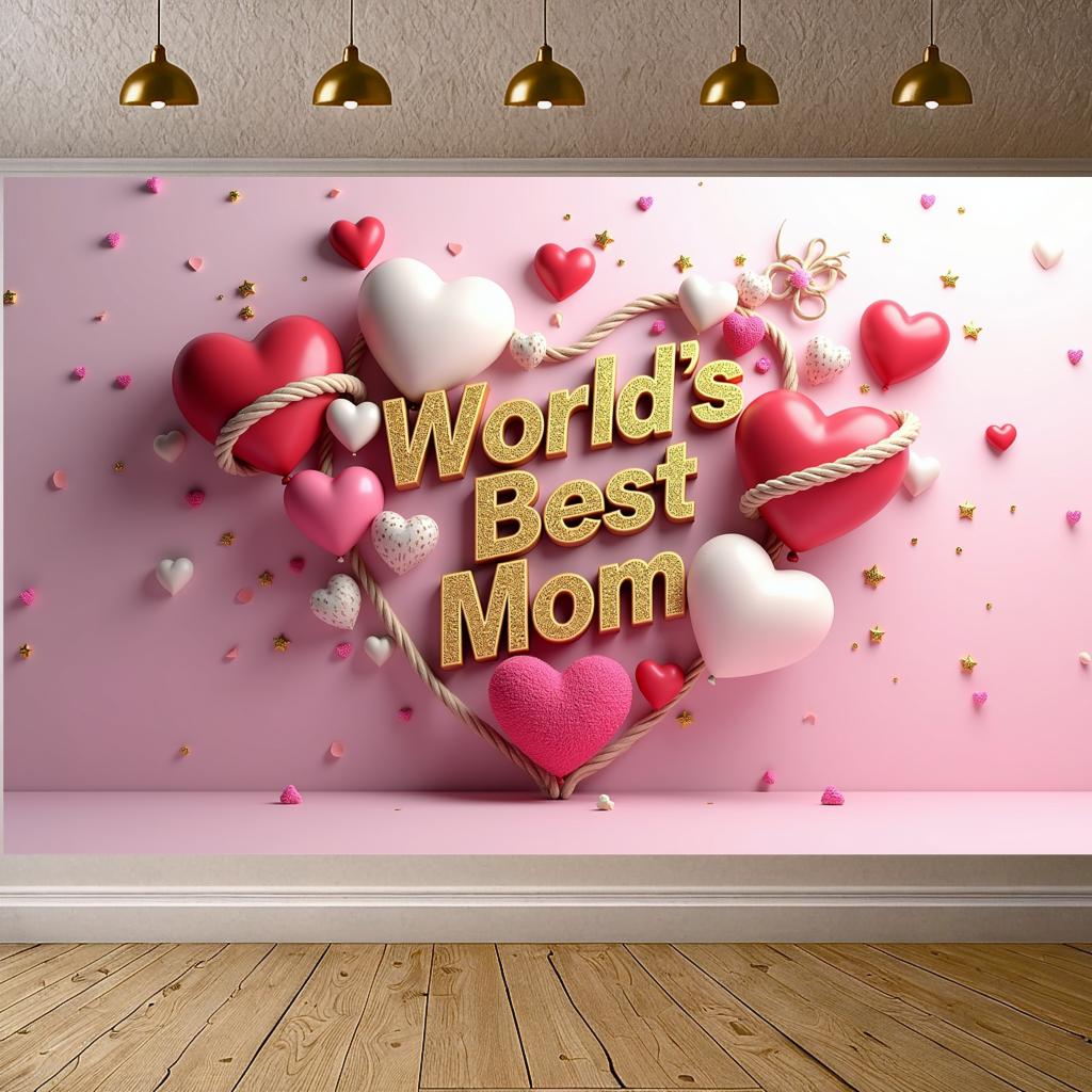 World's Best Mom Banner Heart Shaped Happy Mother's Day Party Decor Photography Background Props Family Gathering Event Backdrop